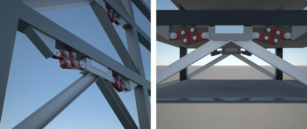 The Multi Unit Friction Dampers are based on a rotational friction concept like all Damptech dampers. The dampers can be installed in frame structures with diagonal bracings like in the figure below where two dampers with four friction joints each are used. The dampers are connected to the structure with pin connections on both sides.